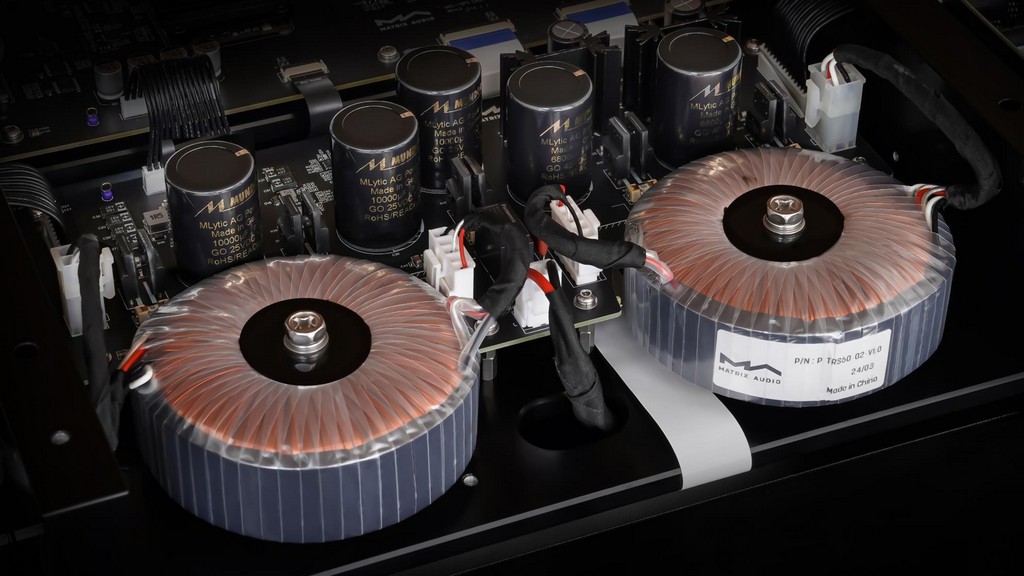 У схемі живлення використовуються два тороїдальних трансформатори з квадратним мідним дротом для схем цифрової та аналогової частини, фільтруючі конденсатори серії M-Lytic AG від MUNDORF, до десятків малошумних і надмалошумних LDO.