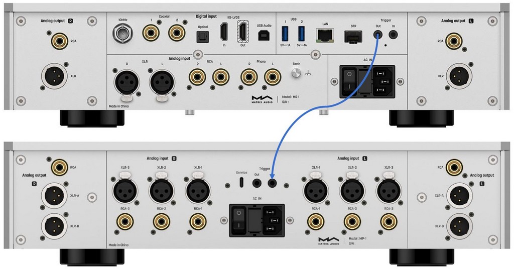 Функція тригера MS-1 працює зі сторонніми пристроями. При підключенні MS-1 до MP-1 через тригерні порти ви отримаєте більше функцій тригера. При використанні монокабелю 3,5 мм, MS-1 управляє включенням і вимкненням MP-1 (стандартна функція тригера). При використанні стереокабелю 3,5 мм, MS-1 може керувати ввімкненням і вимкненням MP-1, регулювати гучність і перемикати вхідні канали (розширене керування).