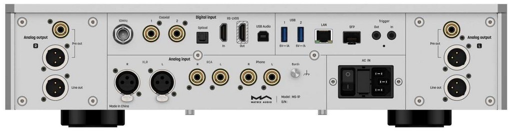 Китайська компанія Matrix Audio, яка блискуче зарекомендувала себе на ринку цифрового користувацького аудіо, створила музичний стример MS-1. Це перша в портфоліо компанії модель такого класу в повнорозмірному (430 x 353 x 106 мм) «стійовому» форм-факторі. Для управління на лицьовій панелі встановлений 8,8-дюймовий сенсорний дисплей, крім того, це перший продукт Matrix Audio, оснащений новим поколінням фірмового додатка MA Player, до того ж перший продукт Matrix Audio, оснащений вбудованим сховищем і перший, оснащений тактовим входом 10 МГц. Апарат підтримує апаратну асинхронну передискретизацію DSD, також забезпечена підтримка оптичних і Ethernet-модулів SFP.