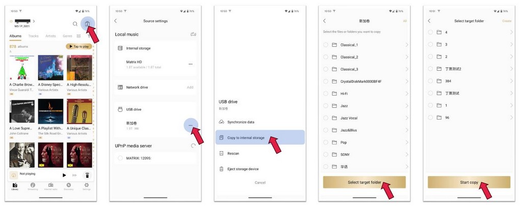 Для цього увійдіть в налаштування джерела в додатку MA Remote, натисніть кнопку меню на USB-накопичувачі, натисніть «Копіювати у внутрішню пам'ять», відзначте папки, які хочете скопіювати, виберіть цільову папку і почніть копіювання.