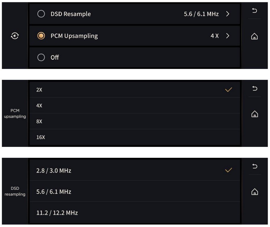 До всіх вхідних сигналів можна застосовувати підвищувальну дискретизацію PCM & DSD доступна PCM передискретизація до 768 кГц і DSD передискретизація до DSD256.