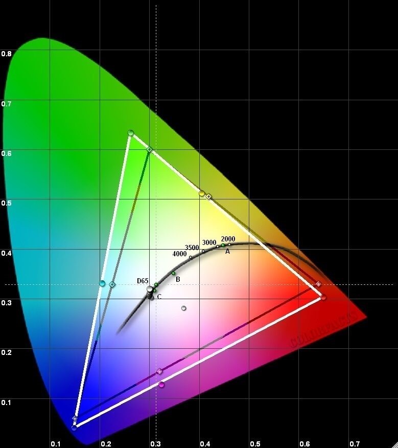 Впрочем, DCI лучше подойдет в качестве отправной точки и для настройки под Full HD, потому что режим ВТ.709 дает излишне зажатую по цветам картинку, охват которой выглядит следующим образом: